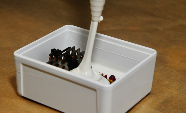 Le potting (enrobage ou encapuslation) consiste à encapsuler entièrement ou partiellement une carte électronique dans une résine protectrice, offrant une barrière contre l’humidité, la poussière, les chocs, les vibrations, les brouillards salins et la corrosion.